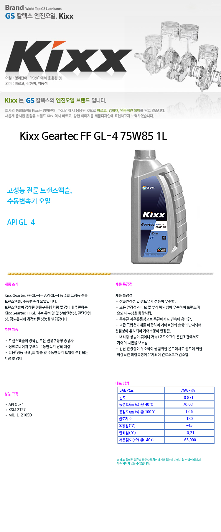 제품소개 제품소개 제품소개 Kixx Geartec FF GL-4 75W85 1L Kixx Geartec FF GL-4 75W85 1L 원산지 대한민국 제조사 GS칼텍스 단위 1L 상품정보 관련상품 리스트